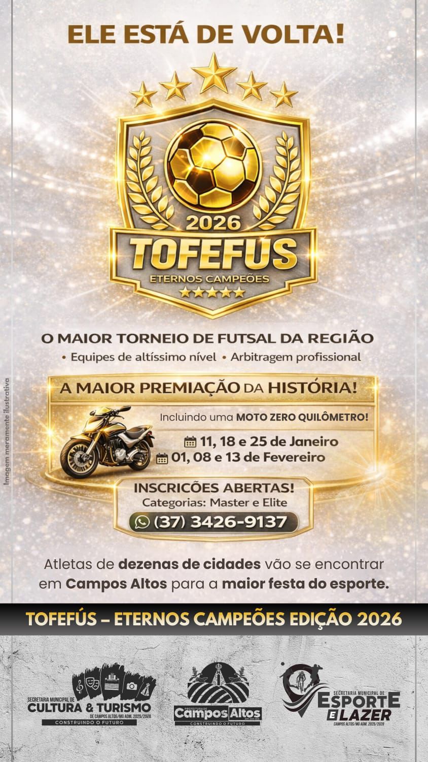 O TOFEFUS 2026 é uma realização da Prefeitura Municipal de Campos Altos, por meio da Secretaria Municipal de Esportes e Lazer, com apoio da Secretaria Municipal de Cultura e Turismo, reforçando o papel do esporte como ferramenta de convivência, organização social e promoção da qualidade de vida no município.